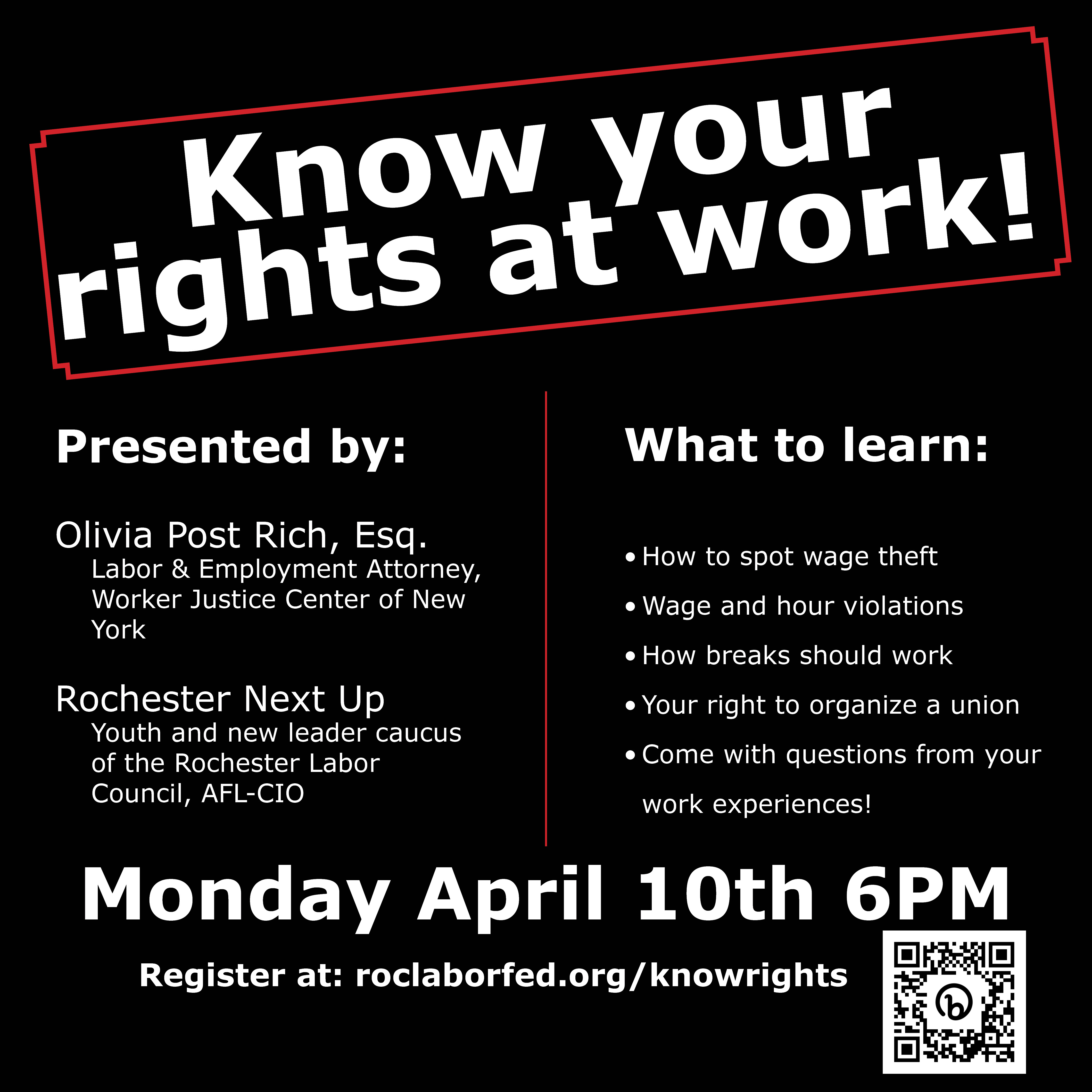 Rochester Next Up, the youth and new leader caucus of the Rochester Labor Council is teaming up with the Worker Justice Center of New York to provide training to local workers. An informed work force is far more likely to be able to defend themselves when faced with these sort of problems.